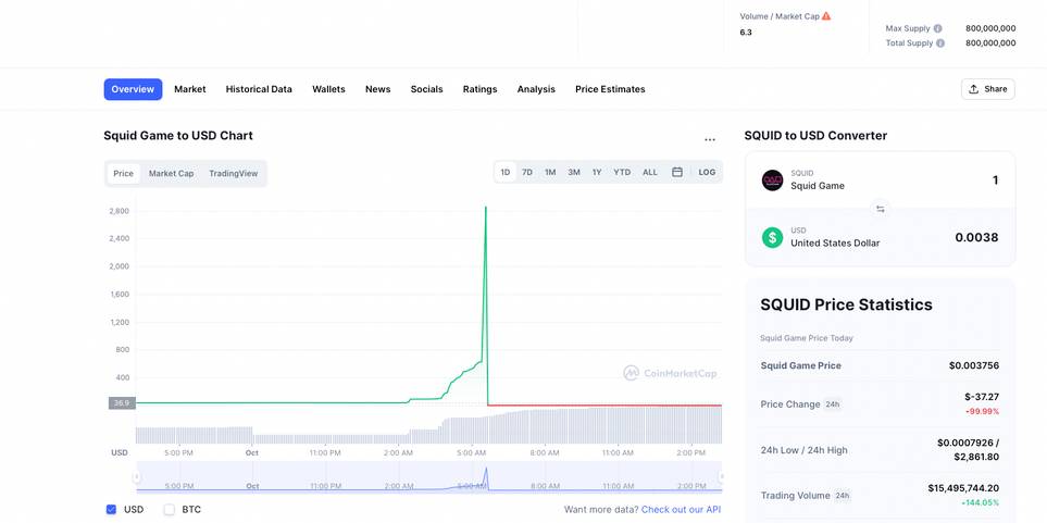 Since then it jumped up by roughly 80000 and an additional 2000 in just one day. Per The Washington Post the value of a Squid Game crypto coin dropped from a high of about 2860 to about zero. Squid Game coin scam highlights danger for crypto investors The SQUID meme coin crashed from a high of 2856 to less than a cent.